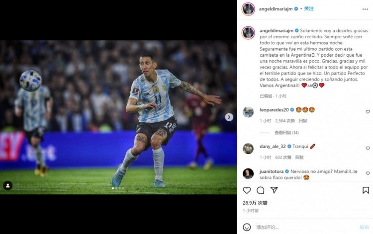 3月28日讯 近日,阿根廷主帅斯卡洛尼在采访中,谈到了迪玛利亚在ins宣布对阵委内瑞拉的比赛是自己在阿根廷国内踢的最后一场国家队比赛这件事。